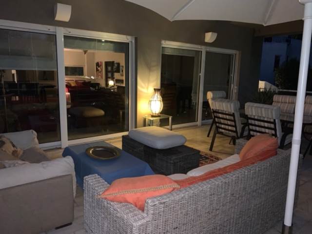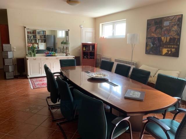 Στο ισόγειο (υπερυψωμένο) υπάρχει μεγάλος χώρος υποδοχής με τζάκι (σαλόνι καιτραπεζαρία),που οδηγεί σε φαρδιές βεράντες, κουζίνα με πρόχειρη τραπεζαρία πουοδηγεί στο επίπεδο του κήπου, της πισίνας και του bbq, καθώςκαι wc.