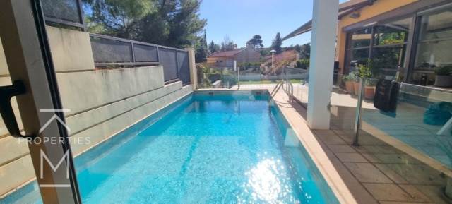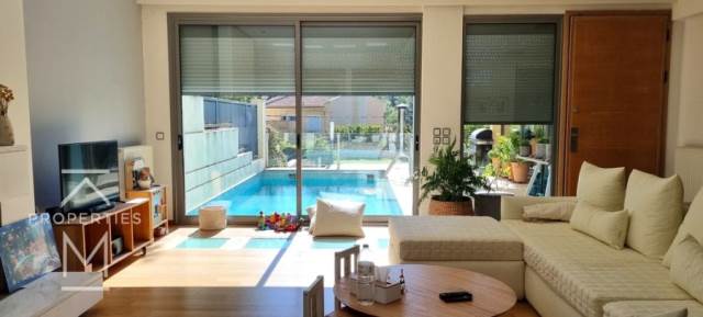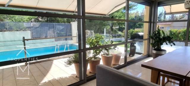 Kifissia, Kefalari, Maisonette For Rent, 350 sq.m., In Plot 400 sq.m., Property Status: Minimal Design, Floor: Ground floor, 4 Level(s), 5 Bedrooms (1 Master), 1 Kitchen(s), 4 Bathroom(s), 1 WC, Heating: Autonomous - Petrol, View: Unlimited, Building Year: 2006, Energy Certificate: B, 2 parking(s), Floor type: Wooden floors, Type of door frames: Aluminum, Features: Elevator, Security door, Security alarm, CCTV, Storage room, Fireplace, Night stream, Electric Appliances, Playroom, Internal Staircase, Double Glazed Windows, Window Screens, Balcony Cover, Balconies, Pets Allowed, Luxury, Airy, Roadside, Bright, AirConditioning, Solar water system, Boiler, Grass, Automatic Watering, Trees, Swimming pool, Back yard (Garden), Painted, Price: 5.500€. KM Properties, Tel: 6981009333, email: katerina.miltsakaki@gmail.com